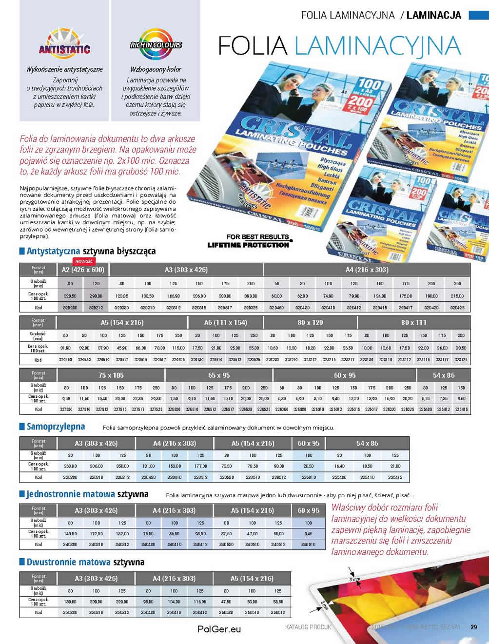 Papierowy „carrier“ * sztywny karton powlekany specjalnym tworzywem do wielokrotnego użytku * gwarancja bezpieczeństwa laminowanego dokumentu * możliwość laminacji z marginesem folii większym niż 3 mm * lepsza jakość laminacji * długotrwałe utrzymanie czystości wałków laminatora * możliwość laminacji jednostronnej