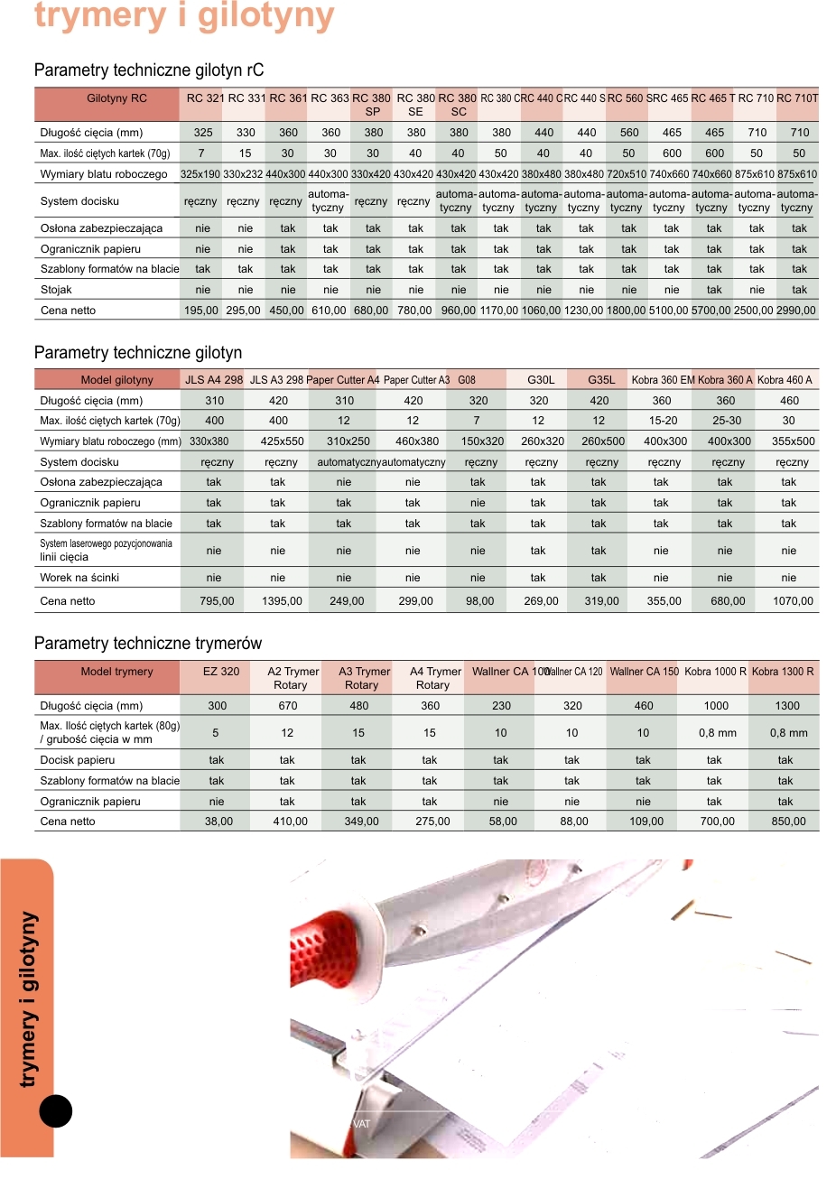PARAMETRY TECHNICZNE GILOTYN I TRYMERÓW takich jak :