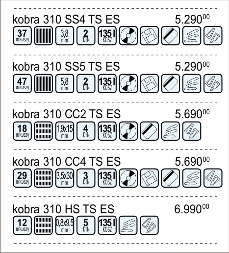 Kobra 310 TS Niszczarki o dużej mocy przeznaczone do dużych biur i urzędów. Umożliwiają niszczenie wydruków komputerowych wraz z perforacją. Posiadają wielofunkcyjny panel dotykowy. * szerokość wejścia 310 mm * jednorazowe niszczenie do 47 arkuszy papieru (310 SS5 TS)• poziom bezpieczeństwa 2-5 DIN * 20 lat gwarancji na noże tnące. Unikalne cechy serii 310 TS: * Touch Screen - wielofunkcyjny panel dotykowy * diody LED sygnalizujące włączone funkcje niszczarki * System EPC - Electronic Power Control - system wskazujący wydajność niszczenia w danym momencie * System SPPU – Super Potential Power Unit - wzmocniony system napędu * System Energy Smart – oszczędność energii dzięki zerowemu poborowi mocy w funkcji stand-by * silnik przystosowany do pracy ciągłej przez 24 godz. na dobę * zabezpieczenie silnika przed przegrzaniem * trwałe noże odporne na zszywki i spinacze * automatyczny start/stop * automatyczne odcięcie zasilania w przypadku zaklinowania papieru lub wyjęcia pojemnika na ścinki * dioda informująca o otwartych drzwiczkach * optyczny wskaźnik napełnienia kosza * osobna szczelina do niszczenia płyt CD i kart plastikowych [2] * rączka ułatwiająca otwieranie pojemnika na ścinki [1] * obudowa na kółkach * osobny pojemnik na ścinki papieru oraz płyty CD i karty plastikowe * pojemność kosza 135 l Tabela parametrów technicznych |